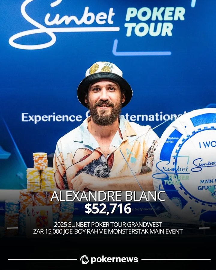 🏆 Alexandre Blanc 🇫🇷 wins 2025 SunBet Poker Tour GrandWest ZAR15,000 Joe-Boy Rahme MonsterStaK Main Event for ZAR908,900 ($52,716) 💰